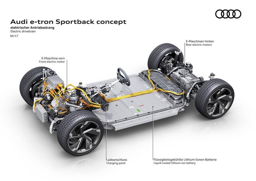 Il concept e-tron Sportback presenta una configurazione che sarà adottata anche per la produzione dei futuri modelli Audi con una trazione completamente elettrica: un motore elettrico sull’asse anteriore e due su quello posteriore per ricreare una trazione integrale quattro Audi. I 320 kW (435 CV) di potenza, che possono arrivare fino a 370 kW (503 CV) in modalità boost, permettono un’accelerazione da 0-100 km/h in 4,5 secondi.