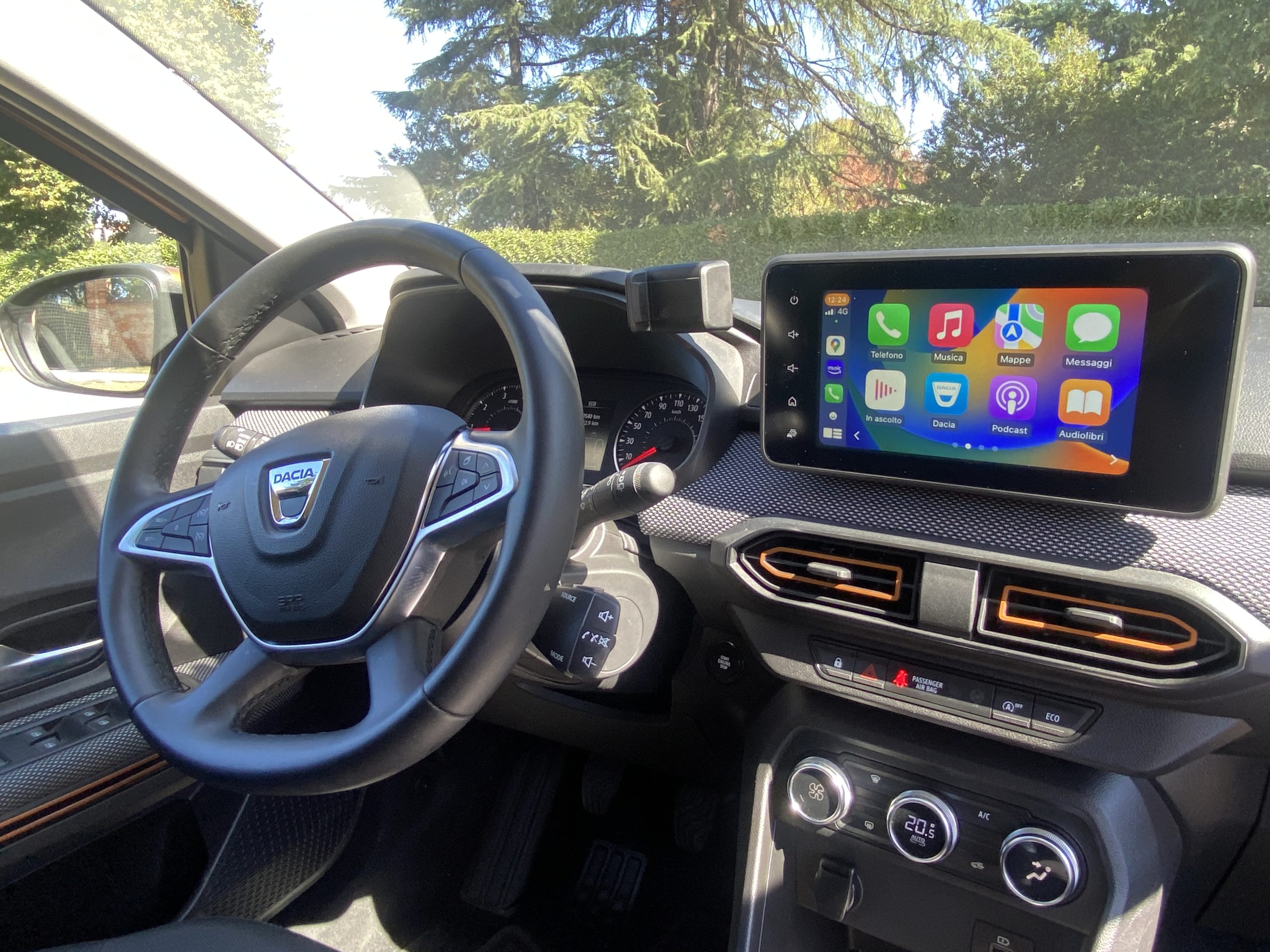La Dacia Sandero Stepway non è affatto una vettura economica e spoglia. Pur essendo un’auto pragmatica, che punta dritto al sodo, si distingue per interni comodi e con discrete finiture. La plancia, semplice, è organizzata bene; centralmente è posizionato il sistema multimediale con schermo a sbalzo da 8″, che è di serie, e permette di configurare Android Auto e Apple Car Play senza utilizzare i cavi (il navigatore si paga a parte). Il sistema multimediale è intuitivo e dispone di tutte le funzioni necessarie. Niente cruscotto digitale; la strumentazione è infatti totalmente analogica, fatta eccezione per un piccolo schermo monocromatico da dove visualizzare le informazioni sui consumi di benzina e GPL. La plancia è rivestita in un tessuto che conferisce una buona sensazione al tatto. Non mancano soluzioni “furbe” come il gancio appendiborse, lato passeggero, e il supporto per il telefonino con presa Usb dedicata.