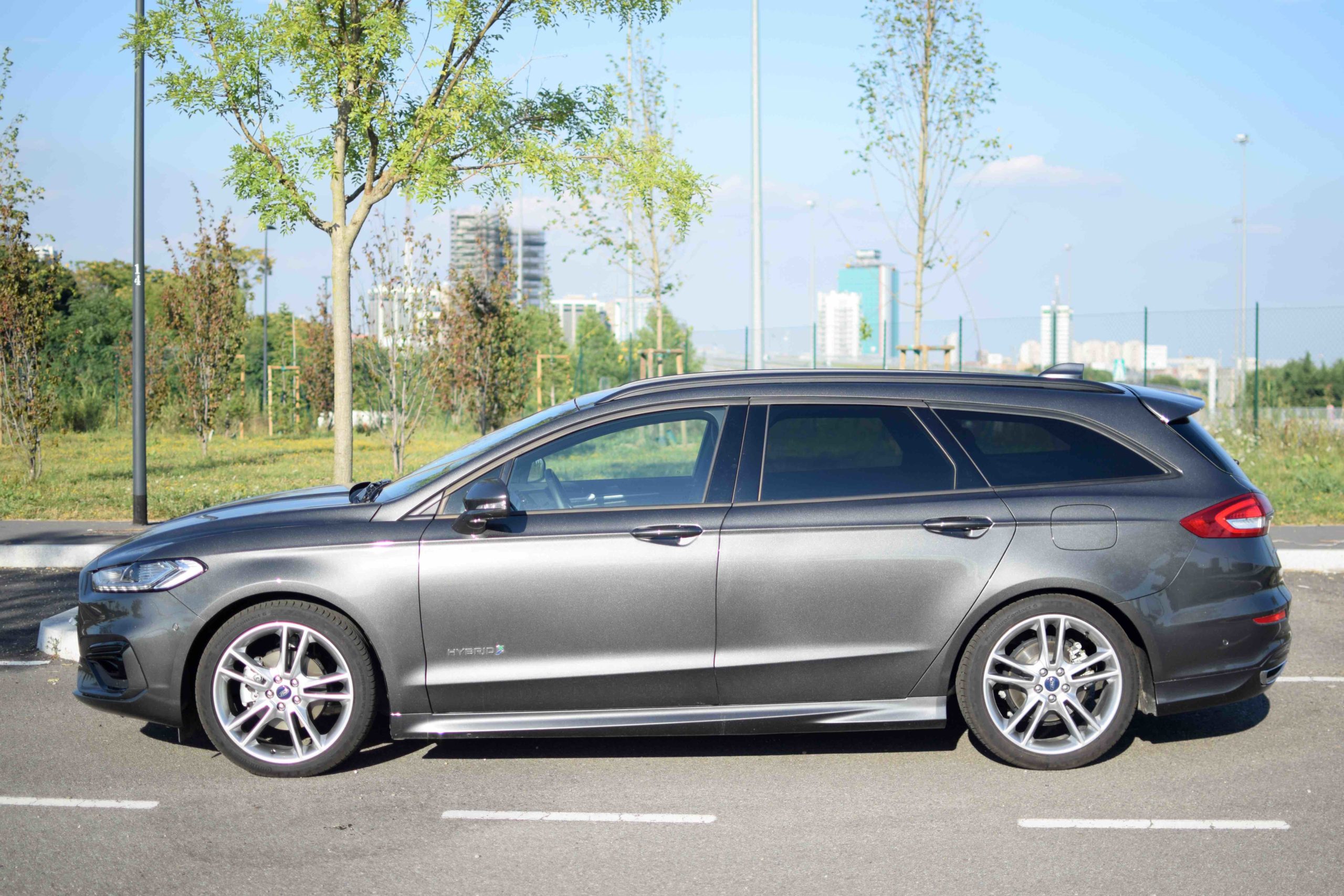 La base della Mondeo ibrida station wagon è chiaramente quella della Mondeo tradizionale, giunta alla quarta generazione, completamente rinnovata nel 2014 e aggiornata nel 2018, con interventi ai paraurti e a fari e fanali. L’auto è prodotta nello stabilimento spagnolo di Valencia. La vettura è lunga 4.867 mm e su strada si lascia notare. A caratterizzarne le finiture ed il carattere troviamo la mascherina specifica St-Line, con motivo a nido d’api, i cerchi in lega d 18″ specifici e il battitacco ST-Line. Pur essendo un’auto di dimensioni generose la Mondeo ha delle linee morbide e risulta ben equilibrata.