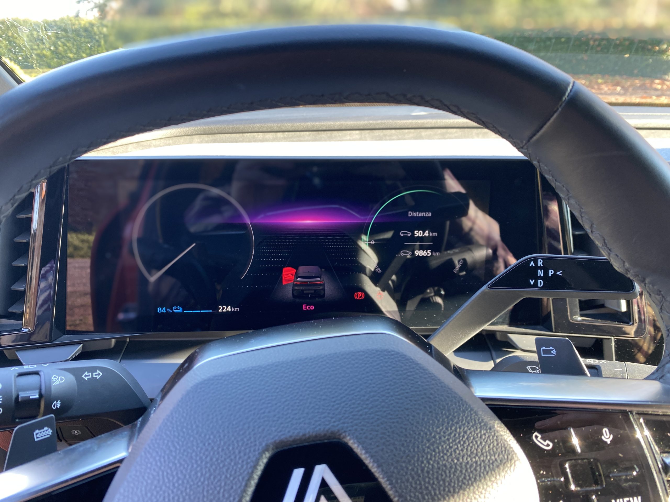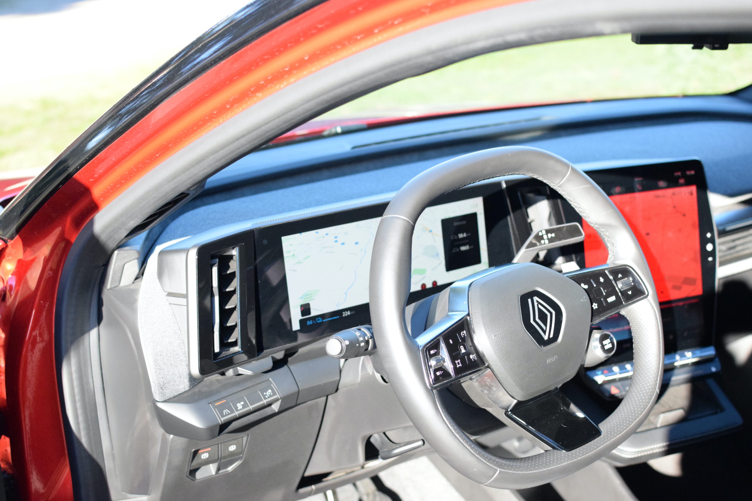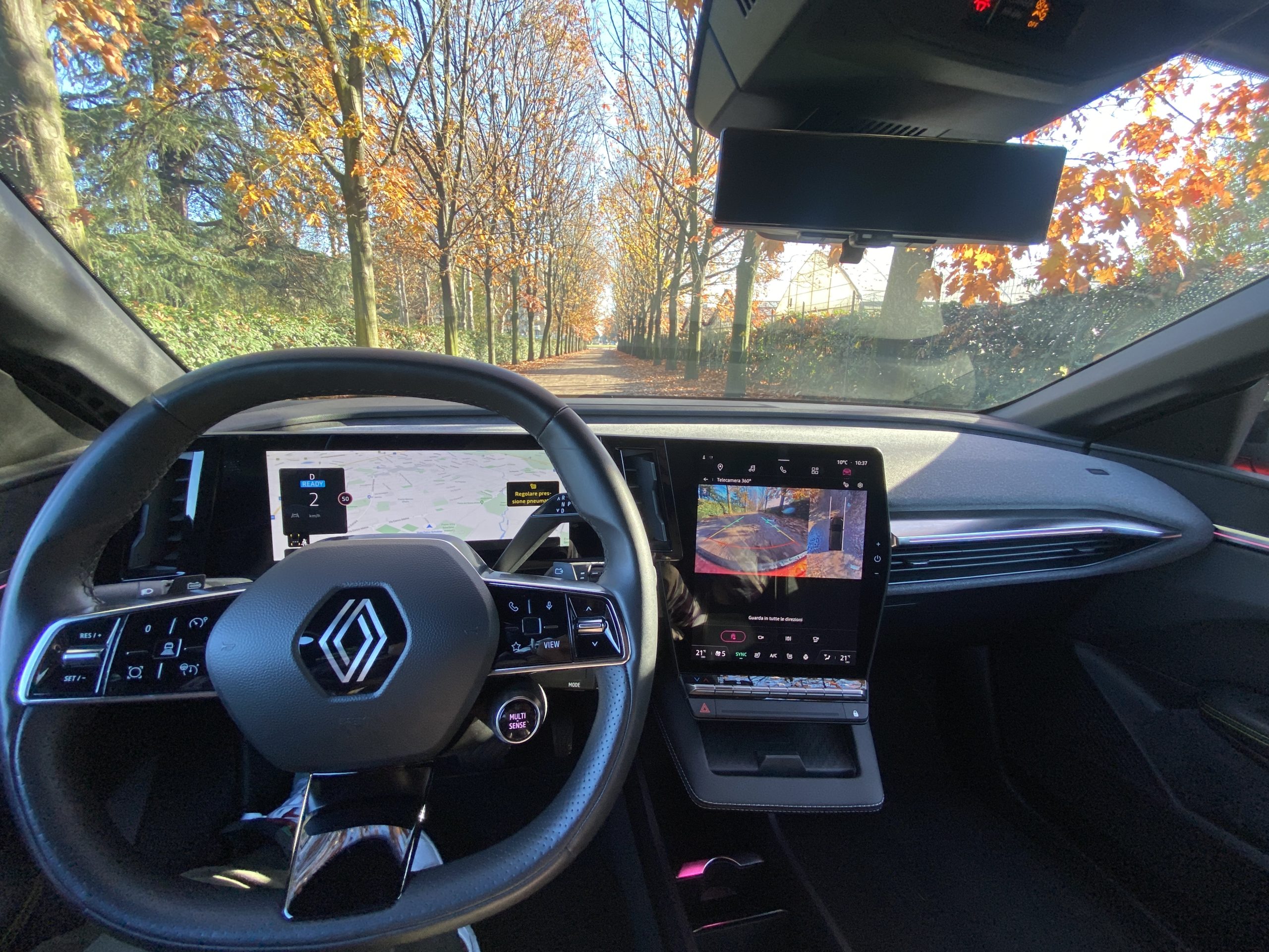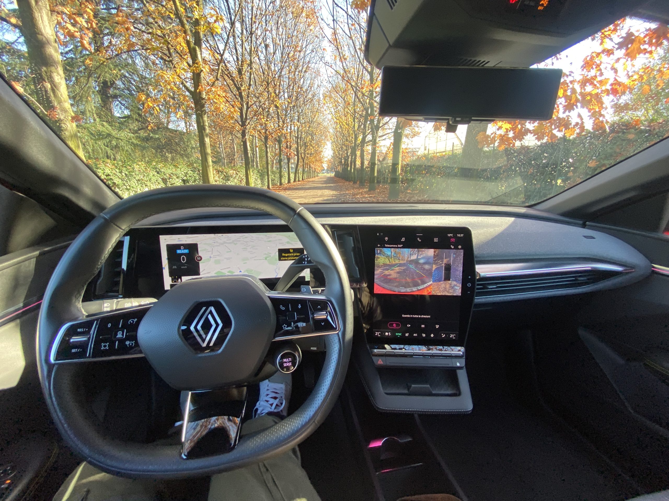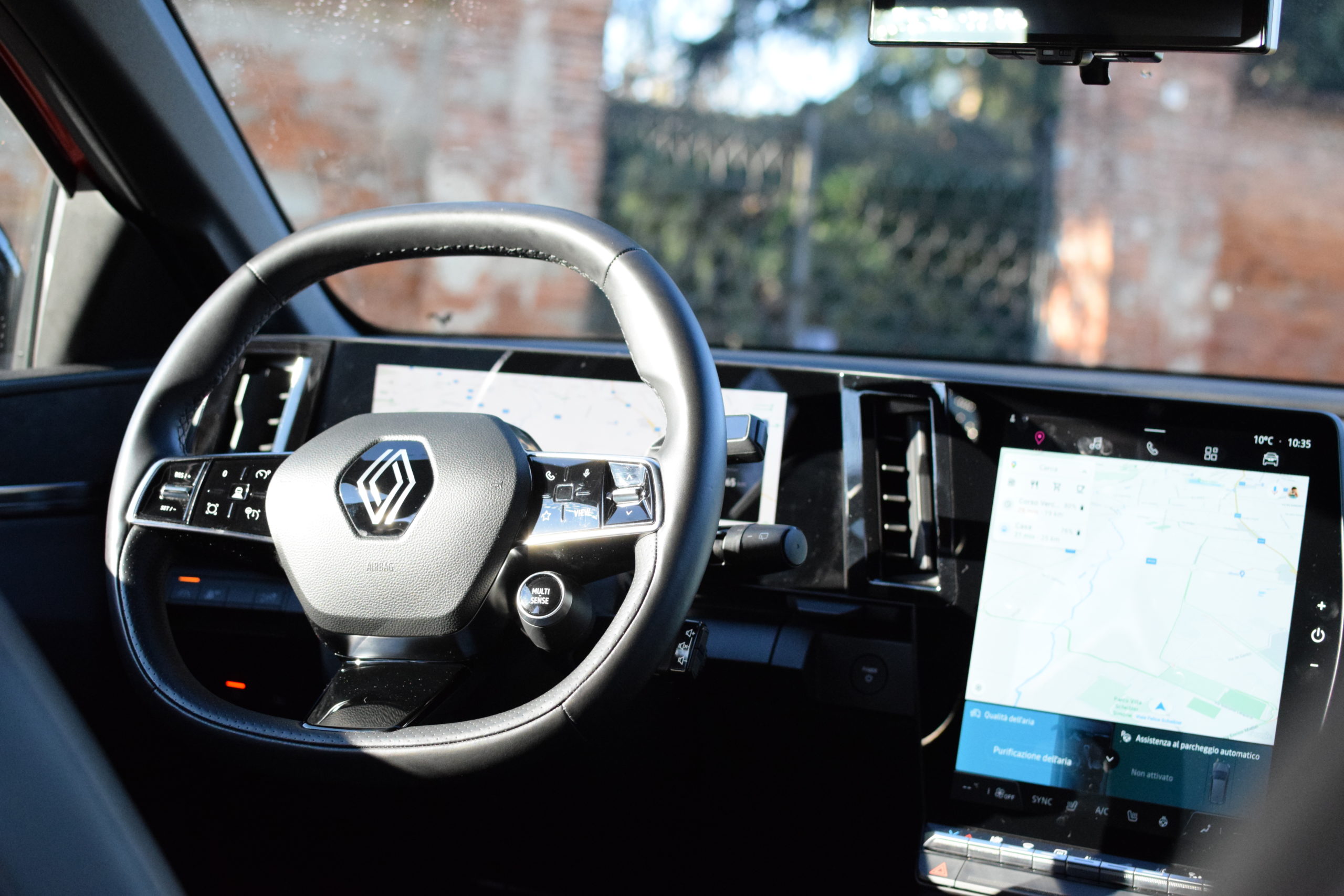 L’elettrica della casa francese ha interni molto moderni, che si distinguono per la “L” costituita dal cruscotto digitale da 12,3” , posto in orizzontale, e per quello verticale del sistema multimediale da 12″. Al di sotto di esso è presente una piccola nicchia dove poter ricaricare il proprio smartphone grazie alla piastra WiFi. Il sistema multimediale della vettura, denominato OpenR e basato su Android Automotive, dispone di tante funzioni che vanno dal navigatore alla gestione del “clima”. Sono quattro le possibilità di visualizzazione: pannello di controllo, mappe, stato della carica, e, l’ultima, quella semplificata. Il sistema multimediale è molto completo e reattivo. L’utente ha la possibilità di impostare il proprio account Renault, che consente di gestire una serie di funzioni da remoto, come la ricarica e il riscaldamento dell’abitacolo, Inoltre, è presente anche il Play Store di Android da cui è possibile scaricare le applicazioni.