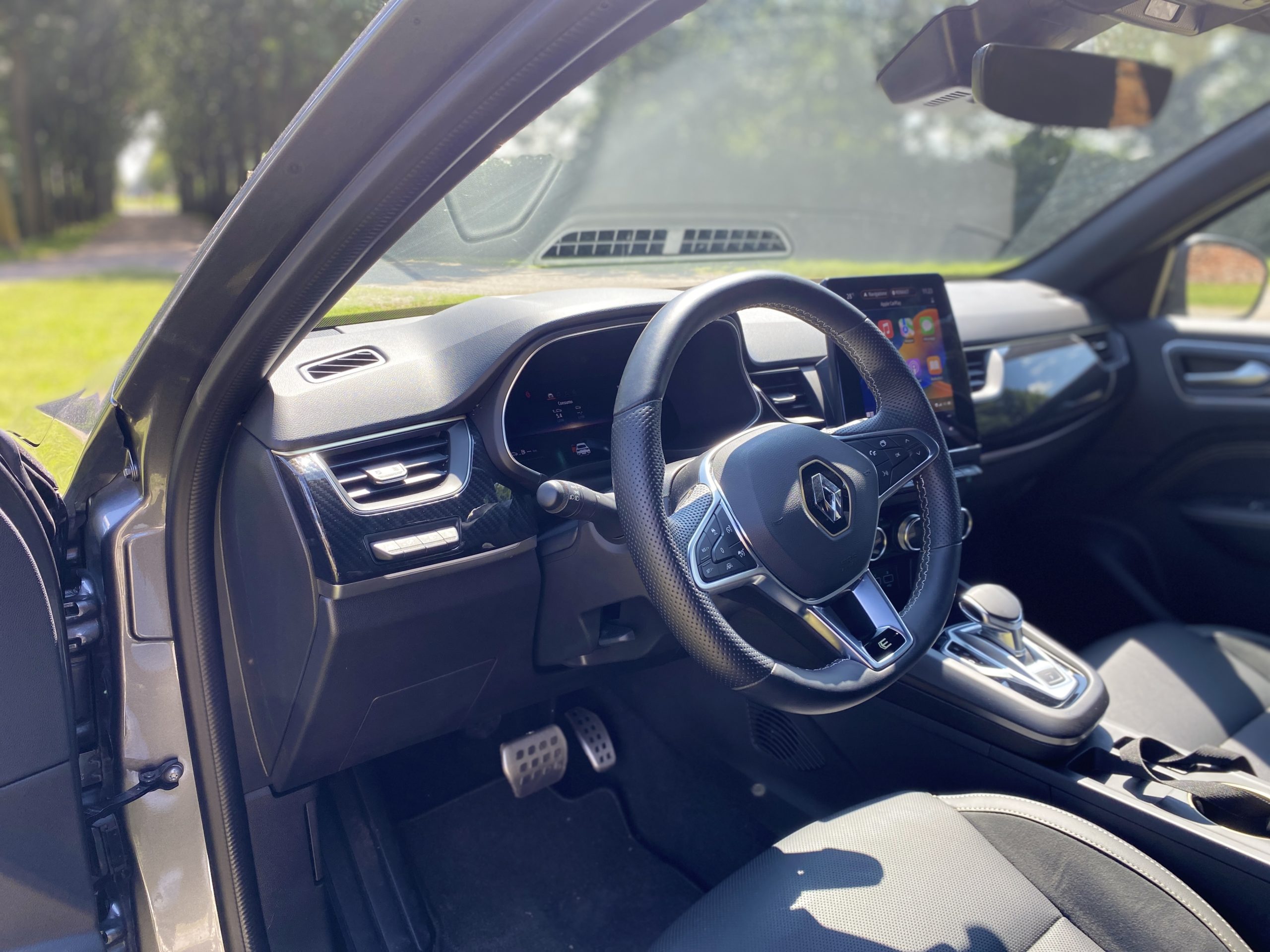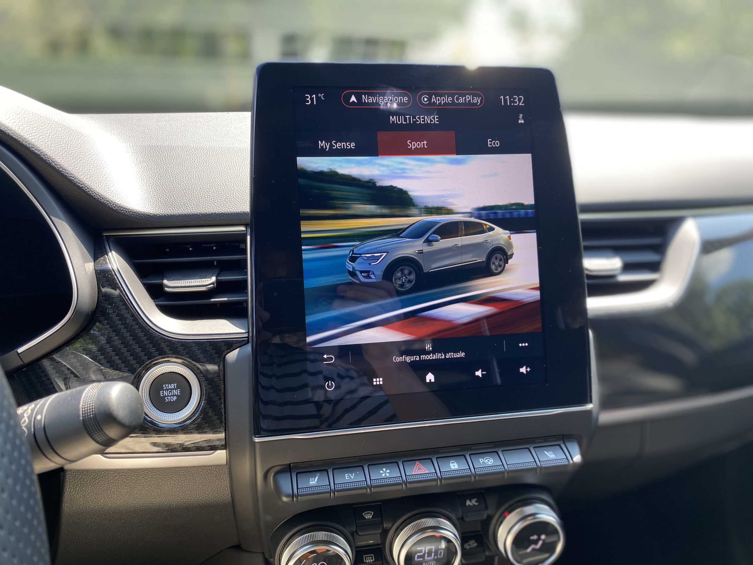 Gli interni della Renault Arkana sono ben fatti. L’impostazione della plancia è quella che abbiamo visto nella “cugina” Captur (le due vetture condividono il medesimo pianale) ed è dominata dallo schermo di tipo touch da 9,3″ posizionato centralmente sul quale gira il sistema multimediale EasyLink. Si distingue per una buona reattività e per essere connesso alla rete. Non manca poi la possibilità di utilizzare Apple Car Play e Android Auto. Attraverso questo pannello è possibile selezionare le tre modalità di guida: Eco, My Sense e Sport. Al netto dell’impostazione minimale della plancia, non mancano i tasti fisici, utilizza per il “clima” e per altre funzioni come il riscaldamento dei sedili e la modalità EV (in città la vettura può viaggiare in modalità elettrica per circa 3,5 km). La qualità complessiva è buona, anche se sono presenti delle plastiche rigide che non restituiscono una buon feedback al tatto. Decisamente comodi i sedili.